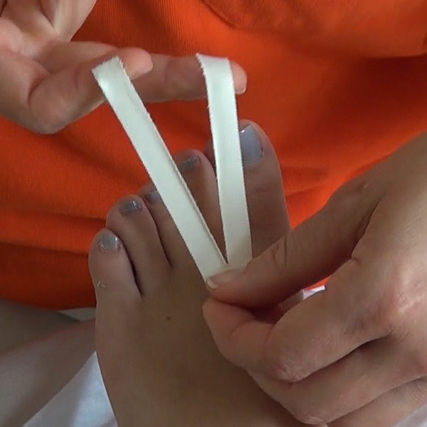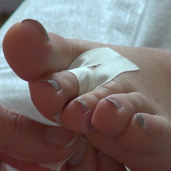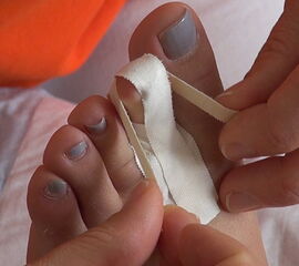 Der hier dargestellte Verband zeigt ein typisches Vorgehen, wie eine minimalinvasiv korrigierte Krallenzehe versorgt wird.