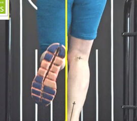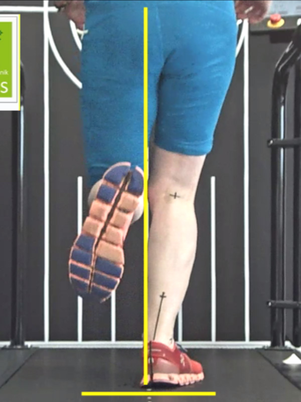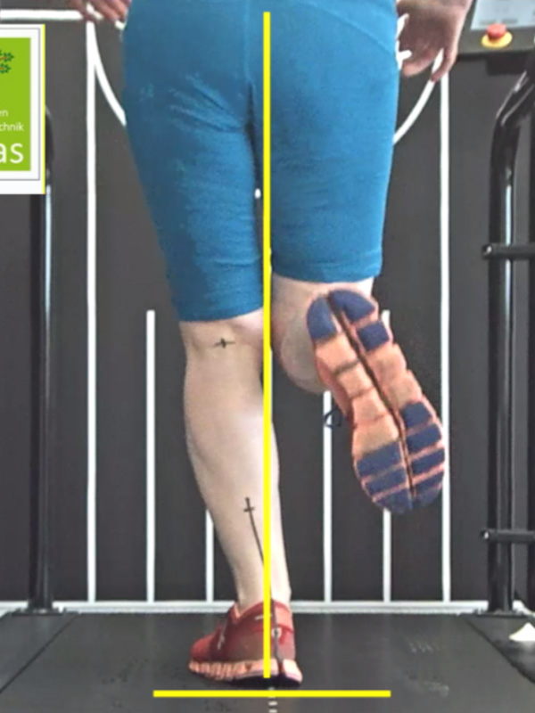 Zunächst ist es wichtig, die Stabilität am Schmerzort, also an Fuß und Sprunggelenk zu verbessern. Für den Bewegungsablauf geeignete Laufschuhe und eine individuelle Einlagenversorgung sollen die Fersenstellung optimieren und können so die physiologische Zugrichtung der Achillessehne wiederherstellen. Dies ist die Grundvoraussetzung für eine physiologische Belastung der Achillessehne. Bei unserer Läuferin ist dies bereits geschehen, wie die Bilder vom Laufen mit den getragenen Laufschuhen und vorhandenen Einlagen zeigen (Abb.14 + Abb.15). Diese lokale Maßnahme hat aber nicht zum Abklingen der Beschwerden geführt, denn durch das weiterhin vorherrschende Overcrossing bleibt der Achillessehnenwinkel bei jedem Schritt erhöht (Abb.16 + Abb.17).