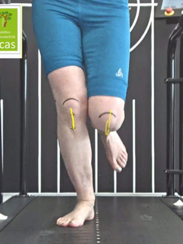 In der Bewegungsanalyse wird zunächst die Fußstellung während der Standphasen in der konkreten Laufsituation deutlich. Hier ist eine deutliche Instabilität des Fußes im Barfußlauf erkennbar, die von einer verstärkten Abduktion des Fußes in der Längsachse begleitet wird (Abb. 5 + Abb. 6). Diese Faktoren führen zu einer unphysiologischen Fußstellung unter dem Schienbein, die Achillessehnenbelastung wird negativ verändert.