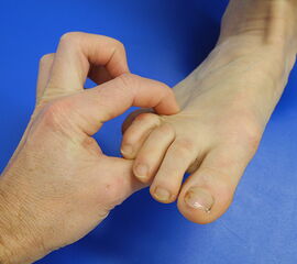 Video: Klingelknopf-Zeichen - Druckschmerz zwischen den Metatarsale-Köpfchen III und IV, seltener auch zwischen II und III bei Druck von plantar. Das Klingelknopfzeichen tritt im Rahmen einer Morton-Neuralgie auf. Teilweise ist der Schmerz von elektrisierendem Charakter (C. Zanzinger/M. Walther).
