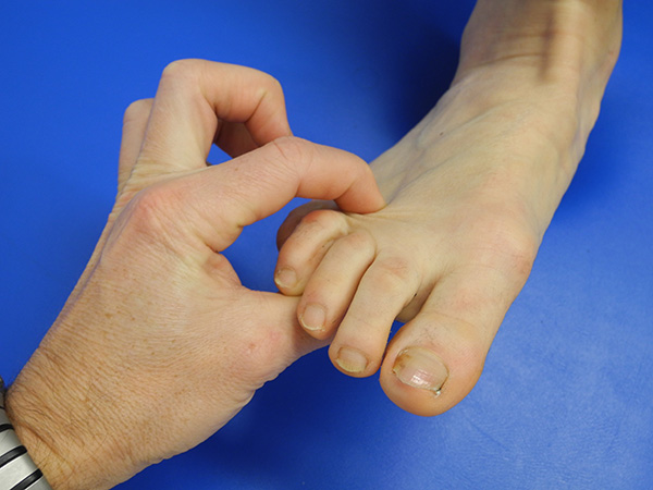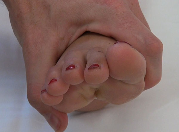 Video: Push up Test. Am unbelasteten Fuß wird durch Druck von plantar die Belastung simuliert, um die Stellung der Zehen bei Belastung zu beurteilen (C. Zanzinger/M. Walther).
