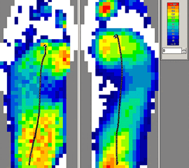 Eine weitere Messbesonderheit besteht darin, dass durch die handelsüblichen Systeme in der Regel nur die vertikal zu den Sensoren eingeleiteten Kräfte gemessen werden können (uniaxiale Messung). Der erste Nachteil liegt darin, dass gerade bei Patienten mit Neuropathie (z.B. Diabetisches Fußsyndrom) die Scherkräfte bei der Evaluation der durchgeführten Einlagen oder Maßschuhversorgung besonders interessieren würde 3, diese Kräfte aber nicht gemessen werden. Zwar gibt es piezoelektrische Sensoren, mit denen es möglich ist auch Scherkräfte zu messen, der Nachteil ist jedoch die Dicke der Sensoren. Bedenkt man, wie stark ein Schuh während des Abrollvorgangs gebogen wird – und damit auch die innen befindliche Messsohle – lassen sich leicht die unterschiedlichen Messwerte erklären, die bei der "in-shoe“-Messung im Vergleich mit der Barfußmessung auf der Messplattform auftreten und somit einen weiteren großen Nachteil darstellen.