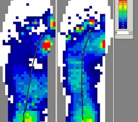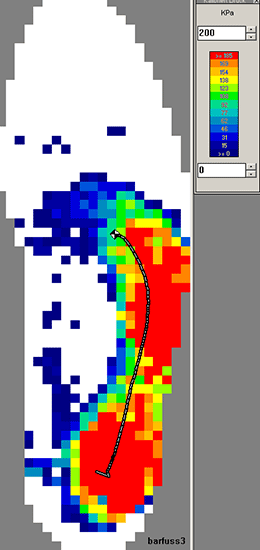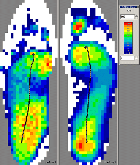 Für die Simulation eines Barfußgangs fixieren wir in unserem Labor für Gang- und Bewegungsanalyse die Druckmessfolien, indem der Patient einen dünnen Strumpf anzieht. Mit dieser Methode können verfälschende Einflüsse des Schuhwerks auf die Schrittabwicklung und Druckverteilung vermieden werden. Die Praktik der in manchen Laboren durchgeführten Verwendung von Ballettschuhen sehen wir u.a. aus hygienetechnischen Gesichtspunkten kritisch.