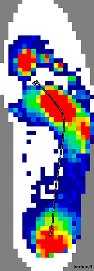 Beim Hohlfuß handelt es sich um eine angeborene oder erworbene Veränderung des Fußlängsgewölbes im Sinne einer medialen und lateralen Überhöhung des Längsgewölbes im belasteten und unbelasteten Zustand. Neurologische Grunderkrankungen oder Muskelerkrankungen sollten im Rahmen der Diagnostik berücksichtigt werden. Aufgrund der Überhöhung des Fußlängsgewölbes mit Steilstellung der Metatarsalia sowie Steilstellung und Varisierung des Calcaneus wird der Mittelfußbereich von der Lastübernahme ausgeschlossen. Im Vorfußbereich kann eine Mehrbelastung der lateralen Anteile resultieren. Nach Grifka ist der Hohlfuß eine dynamische Deformität, bei der die gewölbebildenden Muskeln stärker als die abflachenden Kräfte sind (Grifka, 2005). Das entsprechende Korrelat der pedobarografischen Messung zeigt sich in einer Belastung der Rück- und Vorfußregion unter Aussparung des Mittelfußes. Die Ganglinie verläuft lateralisiert. Teilweise fehlt der Bodenkontakt im Mittelfußbereich vollständig. Liegt eine medialisierte Ganglinie vor, muss kontrolliert werden, ob bei dem Patienten eine Hohlfußmessung durch eine übermäßige Pronation vorgetäuscht wird (Ludwig, 2012).