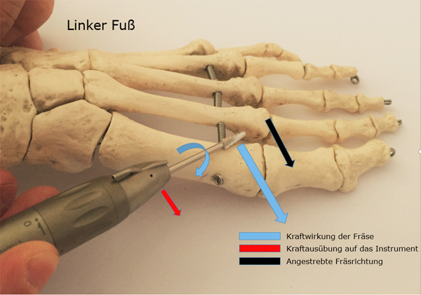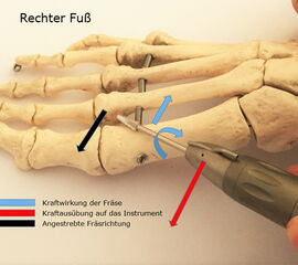 Auf die besondere Gefahr der Verletzung der Extensorensehnen wurde bereits im Abschnitt „Operationstechnik“ hingewiesen. Es muss jedoch nochmals betont werden, dass bei laufender Fräse kein digitaler Druck von dorsal auf das Gelenk ausgeübt werden darf. Die beschriebene manuelle Sehnen-/Kapselretention mittels eines Fadens wird aus Sicherheitsgründen ausdrücklich empfohlen. Die Resektion der distalen Exostosenanteile sollte insbesondere bei noch geringer Erfahrung mit minimalinvasiven Verfahren mehrmals unterbrochen werden, um mit der Fräsenspitze die Grundgliedbasis zu tasten und deren Verletzung zu verhindern. Des Weiteren sollte die Neigung der Fräse zur Achse des Os metatarsale kontinuierlich kontrolliert werden, um eine zu ausgedehnte Resektion des Köpfchens und die damit verbundene Subluxationsgefahr des Gelenkes zu vermeiden.