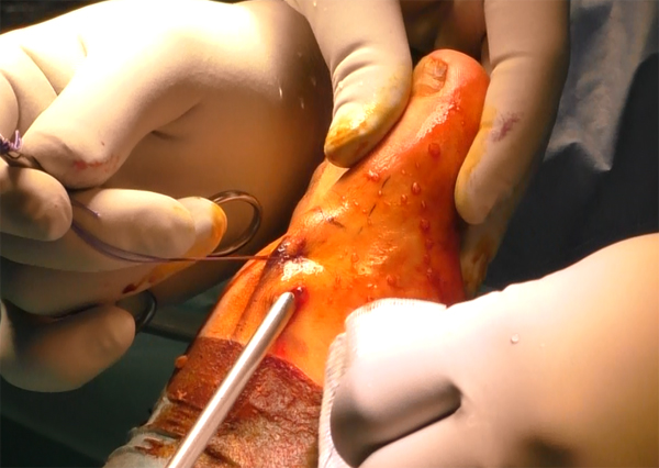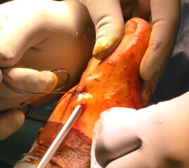 Über eine beeindruckende Entwicklung der minimalinvasiven Fuß- und Sprunggelenkchirurgie wurde in den letzten Jahren viel berichtet. Es ist mittlerweile unumstritten, dass durch die anatomischen Studien, standardisierte intraoperative Vorgehensweise (de Prado 2003) und neue, speziell entwickelte Hardware (Fräsen, Turbinen mit geringen Drehzahlen und hohem Drehmoment sowie Mini-Fluoroskope) gleich gute Korrekturergebnisse im Vergleich zu offenen Methoden erreicht werden können. Vorteilhaft sind zudem eine geringere Zugangsmorbidität und weniger postoperativen Schmerzen, eine schnellere Wundheilung, exzellente kosmetische Ergebnisse und eine in der Regel schnellere Belastbarkeit der Patienten. Problematisch für den unerfahrenen Chirurgen ist bei den MIS-Eingriffen die fehlende direkte Sicht auf das OP-Feld. Die Unsicherheit einer möglichen unvollständigen Osteophytenresektion oder verbliebenen kleinen freien Gelenkkörpern kann bei der Cheilektomie mittels intraoperativer Arthroskopie behoben werden. Die intensive Spülung des Gelenkes entfernt zusätzlich den gesamten Knochenabrieb und verhindert eine prolongierte postoperative Gelenkreizung. Trotz der sehr geringen Weichteilaffinität der Fräsen besteht jedoch immer die Gefahr der Extensorensehnenverletzung. Die hier vorgestellte Operationstechnik beschreibt ebenfalls eine einfache Lösung zum zusätzlichen Schutz der gefährdeten Sehnen.