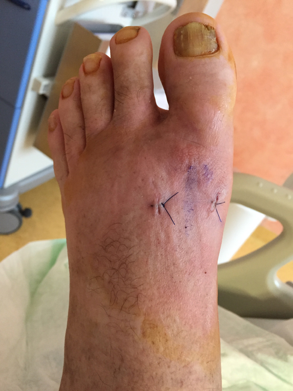 Die Patienten werden in Eigenmobilisation des Großzehengrundgelenks geschult, eine ergänzende physiotherapeutische Mobilisationsbehandlung (Traktionen, Mobilisation, selten Entstauung) ist sinnvoll. Aufgrund der geringen postoperativen Schwellneigung, sind Lymphdrainagen bzw. entstauende Tape-Verbände selten notwendig. Die Abbildungen 11 und 12 zeigen das klinische Bild am 1. postoperativen Tag.