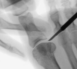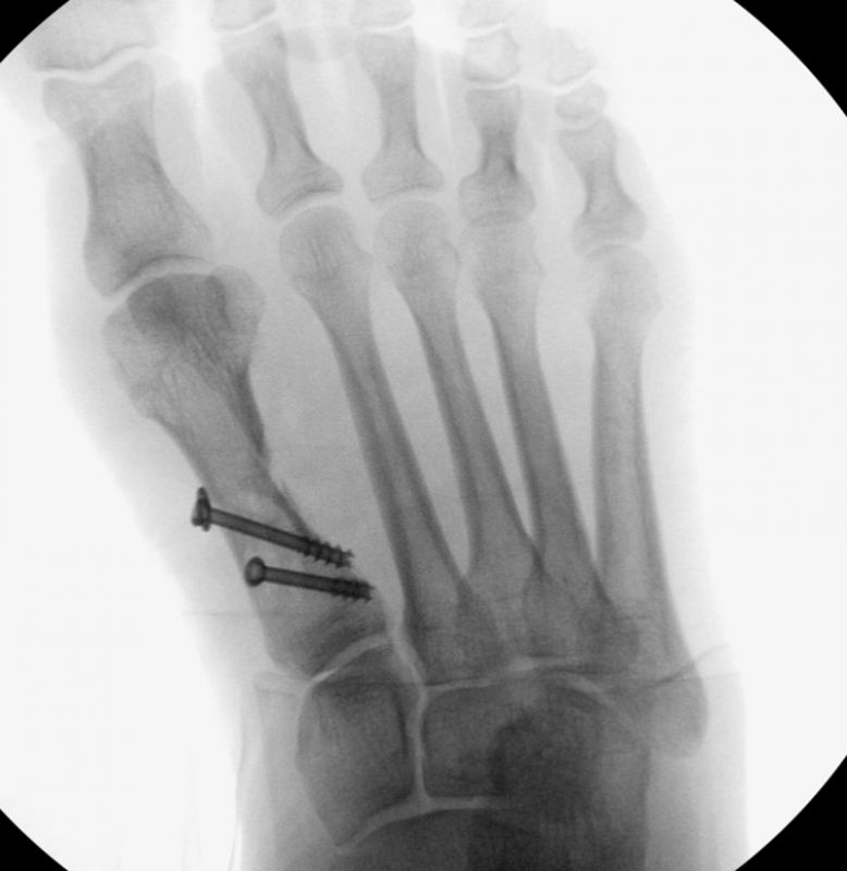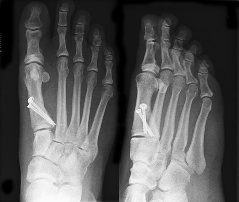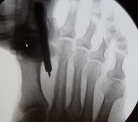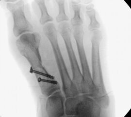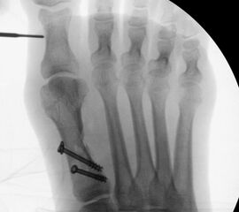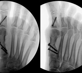 - Röntgenkontrollen (Vorfuß d.p. und seitlich) postoperativ ohne Belastung. Weitere Kontrollen erfolgen 6 Wochen, sowie 3, 6 und 12 Monate jeweils unter Belastung.