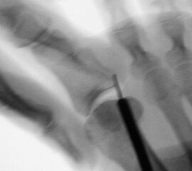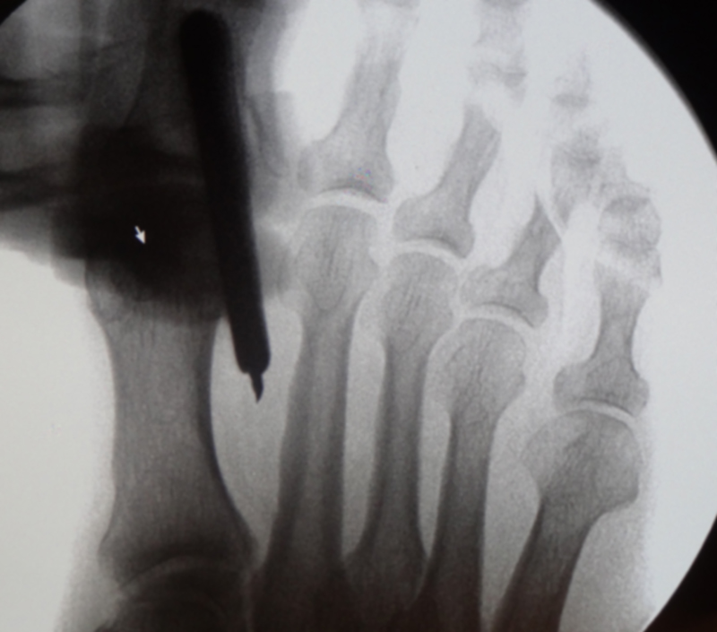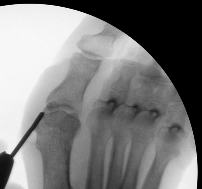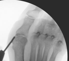 Die minimalinvasive Basisosteotomie des 1. Strahles stellt – entsprechend offenen Verfahren - die Operationstechnik mit dem größten Korrekturpotential dar. Sie kann entweder mit einer medialen Exostosenabtragung des Metatarsale-I-Köpfchens oder aber mit einer zusätzlichen minimalinvasiven subcapitalen medialen Closing wedge Osteotomie (Isham) kombiniert werden 2. Diese Doppelosteotomie stellt ein hochpotentes Werkzeug zur Korrektur von schweren Hallux Valgus Fehlstellung dar. Im Unterschied zu offenen Verfahren an der Basis des Os metatarsale I sind minimal invasiv immer nur in Closing Wedge Technik möglich, womit eine leichte Verkürzung des 1. Strahls verbunden ist. Die Indikation entspricht dem offenen Techniken.