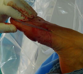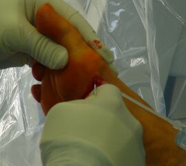 - Die Anlage einer Blutleere- oder Sperre ist optional. Wird eine Blutsperre angelegt ist es noch wichtiger, auf eine ausreichende Spülung zur Kühlung des Gewebes zu achten.