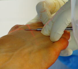 - Eine Knöchel-, Unterschenkel- oder Oberschenkelblutleere kann für den Fall eines möglichen Verfahrenswechsels vorbereitet werden. Für Minimalinvasive Verfahren sollte die Blutleere oder-sperre aber nicht verwendet werden. Der Blutfluss ist für die Kühlung des OP-Gebiets erforderlich. Wird eine Blutsperre angelegt, steigt das Risiko für Hitzeschäden des Gewebes.