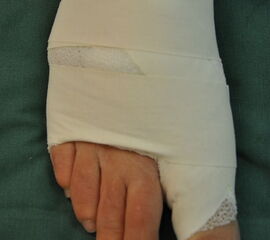 - Physiotherapie mit Lymphdrainagen nach dem 1. Verbandswechsel (7 Tage postoperativ). Die passive und aktive Beübung des Großzehengrundgelenks in Extension und Flexion kann nach Anleitung vom Patienten selbständig durchgeführt werden, alterativ oder in Ergänzung kann Physiotherapie rezeptiert werden.