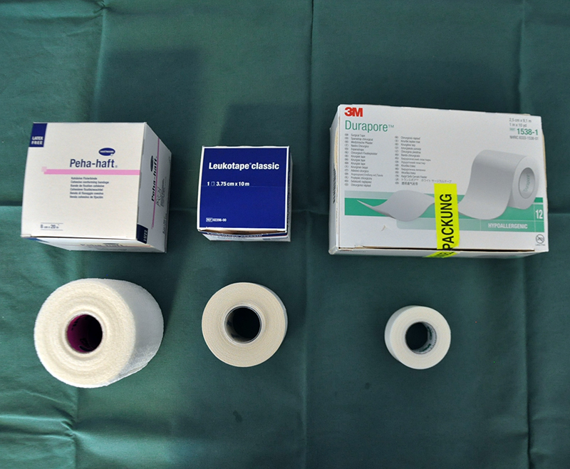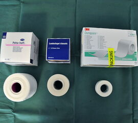 - Für das Anlegen des Spezialverbandes, entsprechendes Verbandsmaterial (sterile Kompressen, 4 cm Haftbinde, Pflaster oder Tapestreifen).