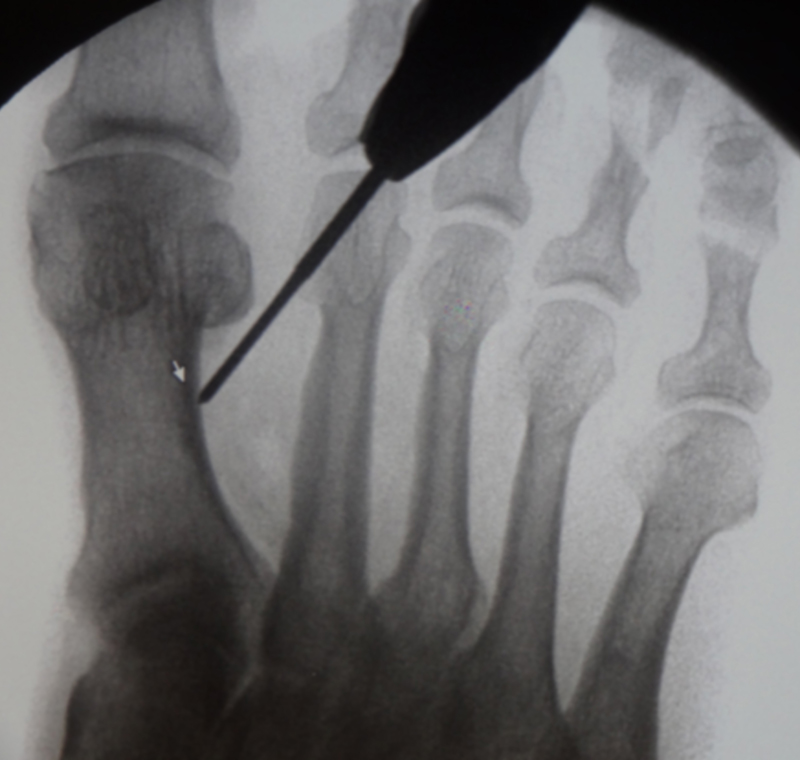 - Gefahr des sekundären Bruches der medialen Kortikalis mit sekundärer Dislokation und Verkürzung des Metatarsale I.