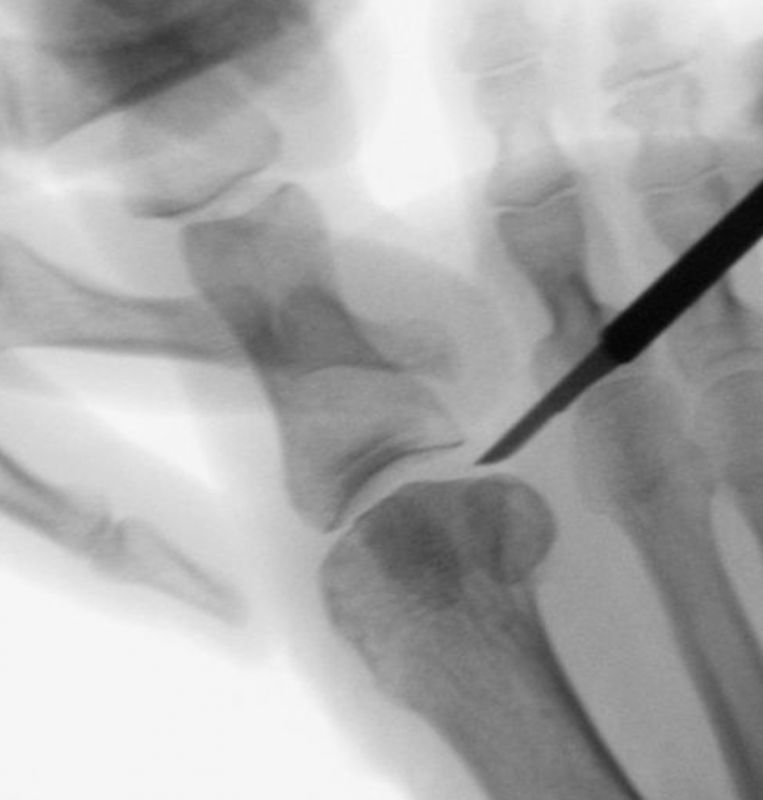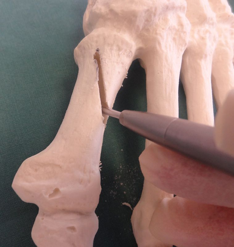 Die hier beschriebene Technik umfasst die Prinzipien der Basisosteotomie, analog dem offenen Vorgehen unter Beibehaltung der bekannten und etablierten Konzepte der Vorfußkorrektur 10.