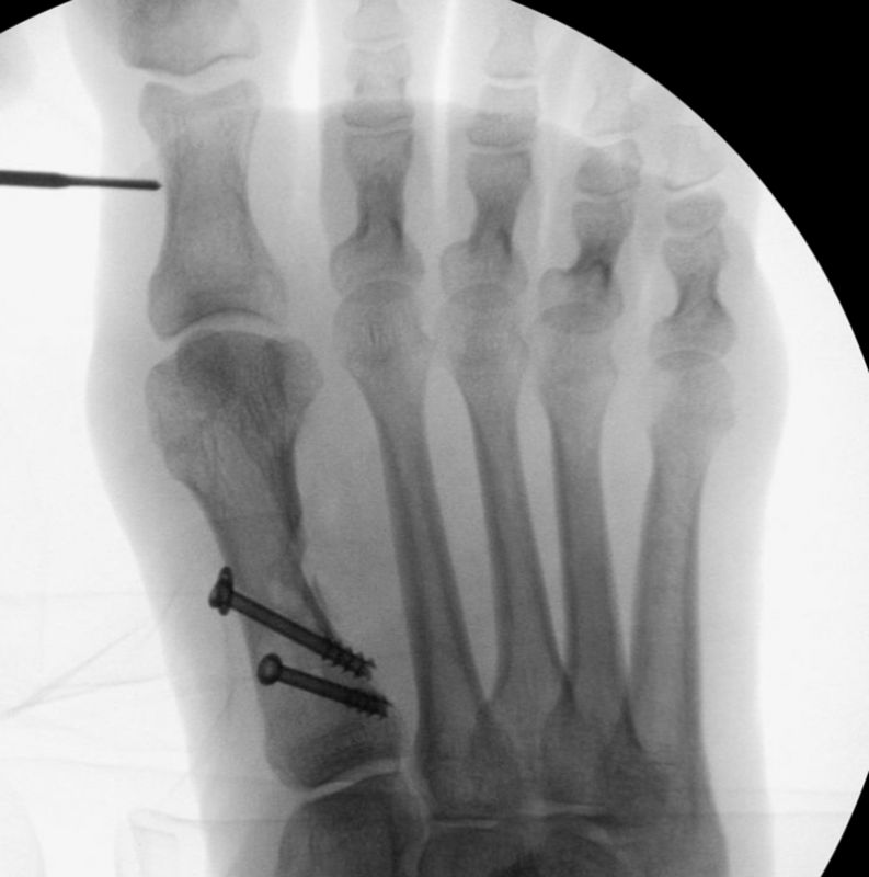 De Lavigne et al. 12 analysierte eine Serie von 6 Patienten im Rahmen einer prospektiven Kohortenstudie die mit einer perkutanen Doppelosteotomie (Basisosteotomie und Isham Osteotomie) behandelt wurden. Der AOFAS Score verbesserte sich von 34 auf 84 Punkte, es wurden keine Komplikationen berichtet. Diaz Fernandez 13 bestätigt diese Ergebnisse an einer Serie von 42 Patienten. Verglichen zum offenen Vorgehen wurde insbesondere das geringere Weichteiltrauma und die kürzere OP Zeit herausgestellt.