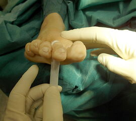 In Anschluss erfolgt eine sorgfältige Spülung der Wunde mit der Knopfkanüle, im Weichteilgewebe befindliche Knochenanteile werden so zur Verhinderung der Bildung heterotoper Ossifikationen ausgeschwemmt. Die Miniinzision kann durch Steristrips oder Naht verschlossen werden. Direkt in Anschluss erfolgt noch im Operationssaal die Anlage des Redressionszügelverbandes, dessen Anlage im Folgenden erläutert wird: