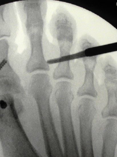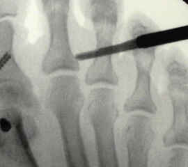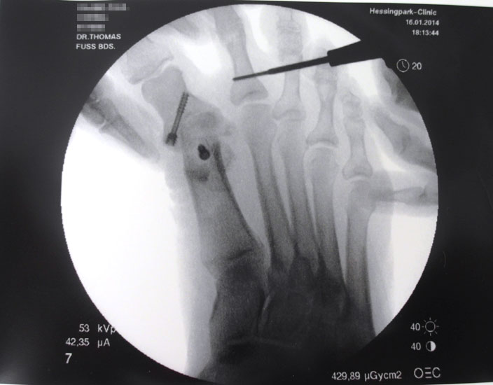 Für reproduzierbare Ergebnisse scheinen uns folgende Punkte im intra- und postoperativen Verlauf wichtig: Unser operatives setup berücksichtigt die Tatsache, dass während der Operation mehrfach durchleuchtet werden muss. Durch die schräge Positionierung des Bildverstärkers unter dem frei zugänglichen Fuss während der gesamten OP entfallen zeitaufwändige Repositionierungen des Bildverstärkers und die einmal eingestellte Ebene bleibt erhalten. Auch bei guten Anatomiekenntnissen und palpablen Strukturen empfiehlt sich eine mehrfache Durchleuchtung zur Überprüfung der korrekten Positionierung von Inzision, Raspel und anschließend der Fräse. Bei der Positionierung der Fräse sollte bei der Hammerzehenkorrektur ohne Abweichung in der Transversalebene streng auf eine Lage im rechten Winkel zur Knochenachse geachtet werden. So können unbeabsichtigte Abweichungen in dieser Ebene nach schräg durchgeführten Osteotomien vermieden werden.