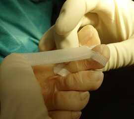 Wichtig: Nach minimalinvasiven Korrekturen der Kleinzehen kommt dem Tapeverband eine entscheidende Rolle zur Sicherung des Operationsergebnisses zu. Da keine zusätzlichen Drähte verwendet werden, führt ein vorzeitiges Entfernen möglicherweise zu einem schlechteren Behandlungsergebnis. Gleiches gilt, wenn die Zehe in einer Fehlstellung stabilisiert wird. Die Stellung der Zehe im Tapeverband sollte der Stellung entsprechen, die als finales Behandlungsergebnis gewünscht wird.
