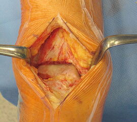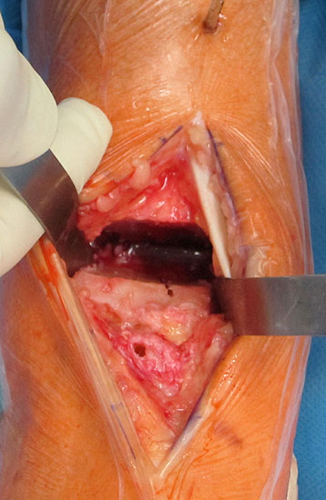- Wundheilungsstörung infolge einer hohen intraoperativen Druck- und Zugbelastung auf den periartikulären Weichteile; Lösung: dosierte Weichteilbehandlung durch die Hacken durch den Assistenten; aktive Erinnerungen während der Operation (Abb. 20 und 21)