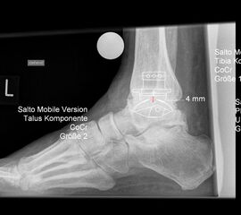 - Bei Überdimensionierung der Prothesenkomponenten: Impingementsymptome, knöcherne Destruktion distale Fibula/Innenknöchel.