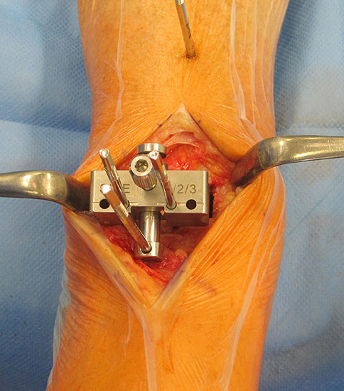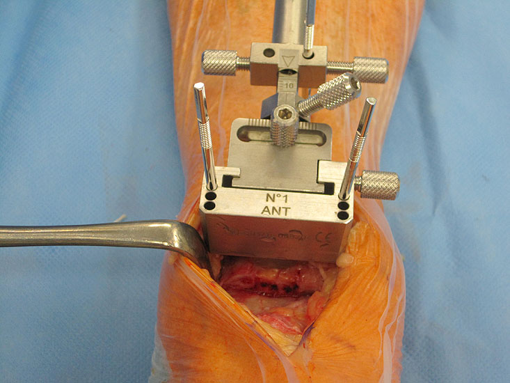 - Stichsäge (Schutz des Innenknöchels, mediale Ausrichtung der Tibiakomponente)