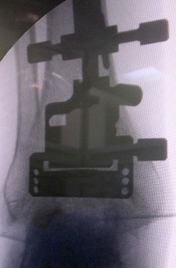 In der operativen Therapie der fortgeschrittenen und schmerzhaften Arthrose des oberen Sprunggelenkes (OSG) haben sich die Implantation einer OSG-Totalendoprothese und die OSG-Arthrodese etabliert. Langzeitprobleme nach einer OSG-Arthrodese in Form von symptomatischen Anschlußarthrosen (bis 80%ige Fusionsrate einzelner oder mehrerer peritalarer Gelenke 10 Jahre nach Arthrodese 12345) forcierten die Weiterentwicklung der OSG-Endoprothetik, trotz der Fehlschläge nach Implantation der einachsigen Zweikomponentenmodelle in den 70er Jahren. Mit der Entwicklung der modernen 3-Komponenten-OSG-Prothesen, welche Seit- und Rotationenbewegungen zulassen und eine zementfreie Implantation mit geringer knöcherner Resektion ermöglichen, konnten gute mittlere Standzeiten erreicht werden, so dass die Implantation einer OSG-Prothese inzwischen eine gleichwertige Alternative zur OSG-Arthrodese darstellt 6789 (Hintermann 2005).