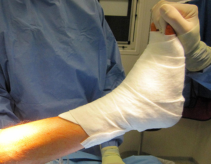 - 1.-6. Woche Ruhigstellung in einer dorsalen Unterschenkel-Kunststoffschiene, nach Abschwellung am Tag Ruhigstellung in einem Unterschenkelwalker, zur Nacht in der Schiene; bei knöchernen Zusatzeingriffen bzw. Sehnentransfers weitere Ruhigstellung im Unterschenkelwalker am Tag bis Ende der 12. Woche; aktiver Hinweis auf einen vollständigen Fersenkontakt im Walker zur Vermeidung einer Spitzfußkontraktur.