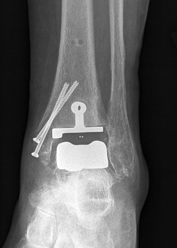 - Prothesenlockerung: Komponentenwechsel möglich, wenn eine ausreichende Knochensubstanz zur Wiederverankerung einer zementfreien Revisionskomponente vorhanden ist. Alternative: Prothesenausbau und nachfolgende OSG Arthrodese, ggf. Erweiterung auf eine pantalare Arthrodese bei großen knöchernen Defekt am Talus mit Destruktion des Subtalargelenkes erforderlich
