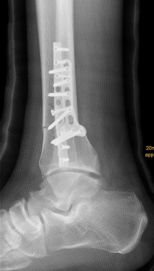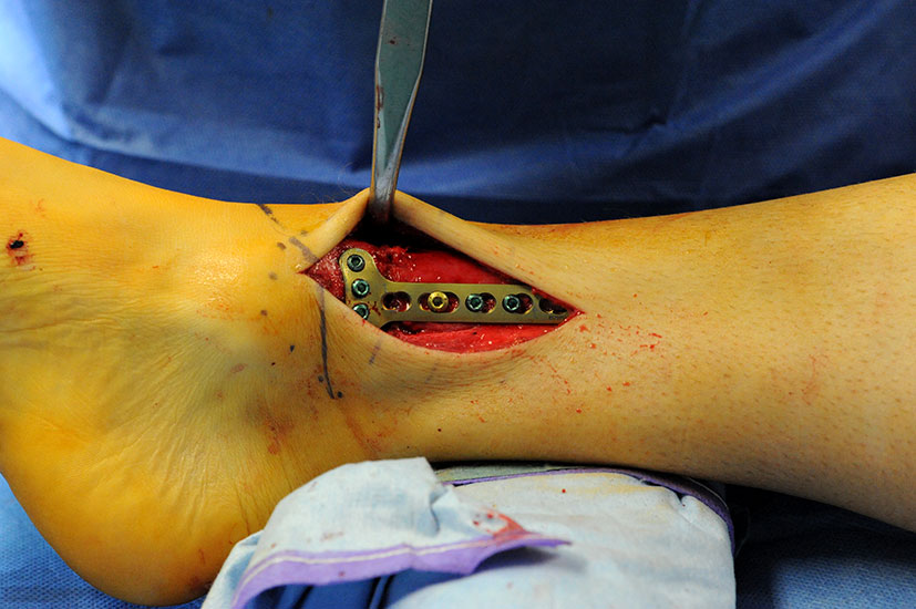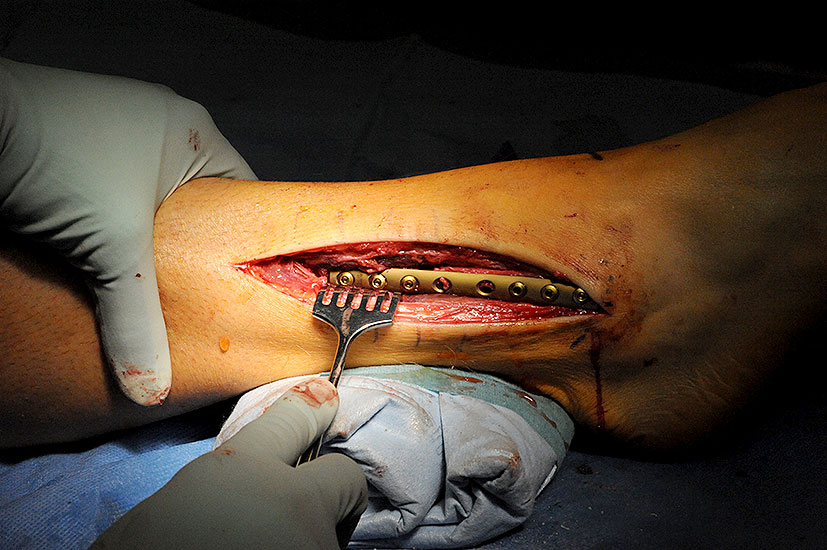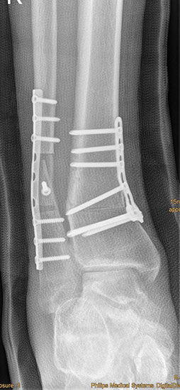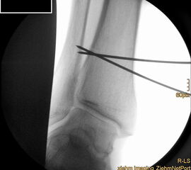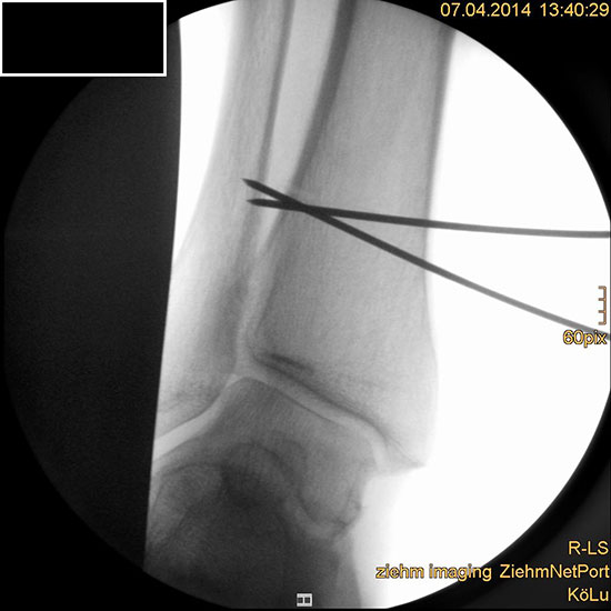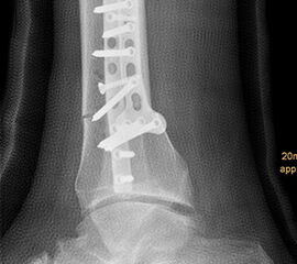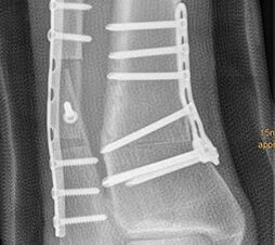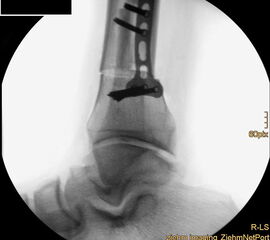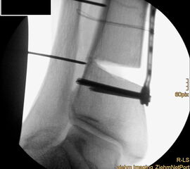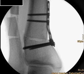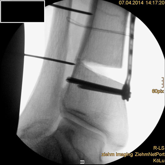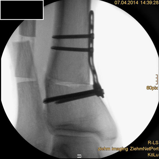 Wir benutzen zur Osteosynthese 3,5 mm LCP T-Platten. In der intraoperativen Röntgenkontrolle kann im seitlichen Bild die Zentrierung des Talus überprüft werden, und ggf. durch eine milde extendierende oder flektierende Korrekturkomponente verbessert werden 18. Eine begleitende Deformität der Fibula korrigieren wir üblicherweise mit einer z-förmigen Osteotomie die wir mit einem 1/3 Rohrplättchen sowie einer Zugschraube sichern 18.
