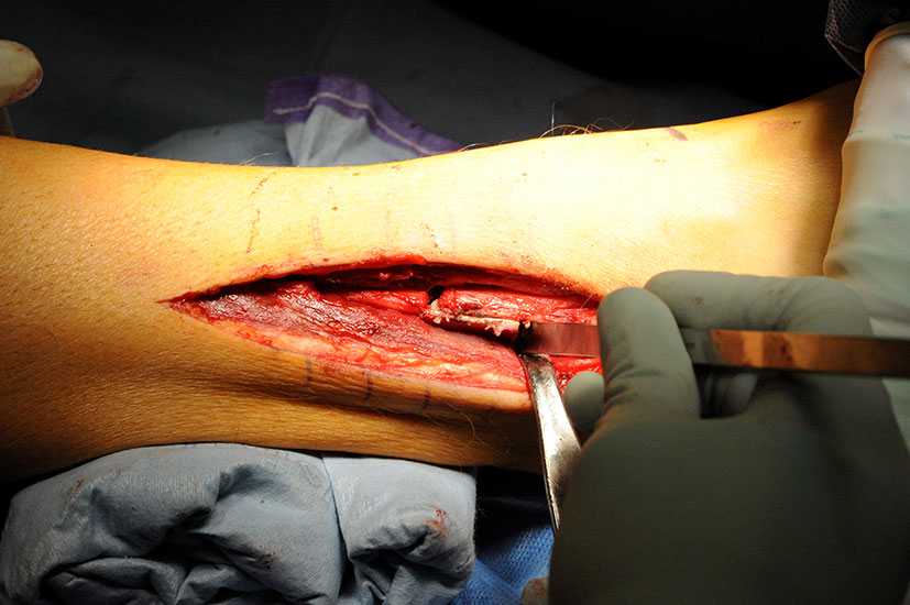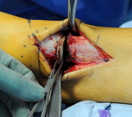 Valgische Achsabweichungen der distalen Tibia können mit medial schließenden oder lateral öffnenden Osteotomien addressiert werden. Wir bevorzugen die medial schließende Osteotomie außer bei Patienten mit vorbestehender Beinverkürzung der betroffenen Extremität 2. Grund dafür ist, dass bei der schließenden Osteotomie kein Knochentransplantat einheilen muss, und dadurch potentiell die Ausheilungszeit kürzer ist. Zudem muss bei der lateral öffnenden Osteotomie die Fibula mit osteotomiert werden, was bei medial schließenden Tibiaosteotomien nur bei ausgedehnten Korrekturen notwendig ist.
