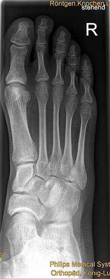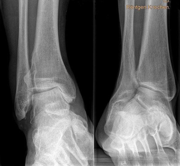 Die Standardröntgendiagnostik bei Fußfehlstellungen und asymmetrischen Arthrosen besteht in stehenden Aufnahmen des Fußes in 2 Ebenen (dorsoplantar und lateral), sowie einer stehenden ap Aufnahme des Sprunggelenks und eine „hindfoot alignment view“ nach Saltzman, mit der die inframalleoläre Rückfußachse beurteilt werden kann 7. Ganzbeinstandaufnahmen sind essentiell, um die mechanische Achse der gesamten unteren Extremität zu analysieren. Zur genauen Analyse des Knorpelzustands bietet sich die Kernspintomographie an. Für spezielle Indikationen steht das SPECT-CT zur Verfügung.