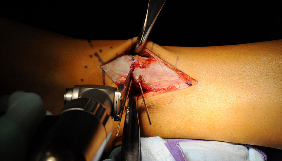 - M. tibialis anterior, M. extensor hallucis longus (vorderer Zugang)