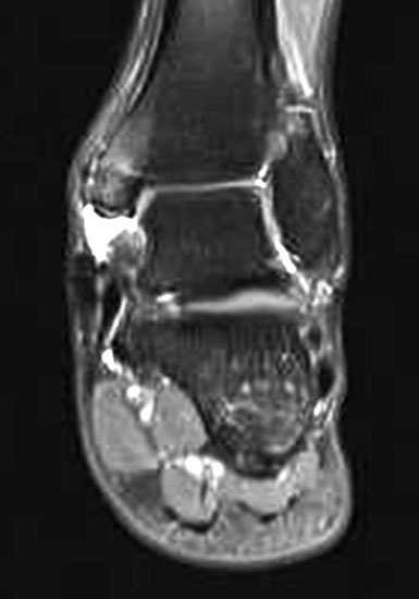 Aufgrund der geringen Zuverlässigkeit der klinischen Untersuchung und der konventionell radiologischen Bildgebung ist die Bildgebung der Wahl die Kernspintomographie (Szeimies 2014). Allerdings bestehen auch bei der Kernspintomographie klare Grenzen, vor allem hinsichtlich der Beurteilung der mechanischen Stabilität. Zuverlässige Aussagen sind möglich zum Ausmaß der Verletzung, insbesondere welche Bandanteile betroffen sind, sowie zu Begleitverletzungen. Chun et al. 11 berichteten über eine Sensitivität von 84% und eine Spezifität von 93,5% für Läsionen des Deltabandes im MRT. Befunde im MRT umfassen eine flächige Ödematisierung und Einblutung entlang des Deltabandes, meist unter Aussparung der kräftigen Pars tibiotalare posterior. Ein gewellter Verlauf, sowie eine Unterbrechung der Kontinuität der Faszikel sind Zeichen eines strukturellen Schadens. Teilweise finden sich Knochenkontussionsödeme, aber auch kortikale Absprengungen am lateralen Talusrand, der Talusschulter und am Außenknöchel. Fast immer findet sich ein Gelenkerguss (Abbildung 4).