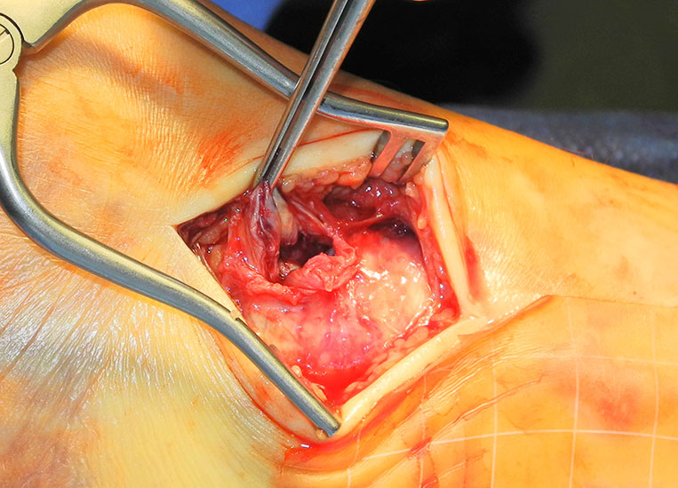 Ausrisse des Deltabandes am Innenknöchel (Typ I Läsionen) lassen sich mit transossären Nähten oder mit Fadenankern fixieren. Der Knochen wird an der ventralen Kante des medialen Malleolus angefrischt. Falls erforderlich kann ein Fadenanker im Bereich der anatomischen Insertion des Bandes gesetzt werden (ca. 4-6 mm proximal der Innen­knöchelspitze) (Abbildung 9).