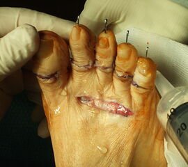 Ausgiebige Spülung. Der Hautverschluss erfolgt mit Einzelknopfnähten. Der Verband erfolgt mit braunolgetränkten Kompressen, mit denen die Zehen in Plantarflexion gezügelt werden können. Zur Entspannung der Wunde legen wir bis zum Abschluss der Wundheilung eine dorsale Unterschenkelgipsschiene in Neutralstellung des oberen Sprunggelenkes an. Postoperativ sollte eine radiologische Kontrolle erfolgen.