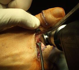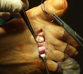 Zur Tenosynovektomie wird die Hautinzision in Längsrichtung über der betroffenen Sehne durchgeführt. Unter Schonung der Gefäß- und Nervenstrukturen dann die Sehnenscheide dargestellt und eröffnet. Das entzündliche Gewebe muss, um Rezidive zu vermeiden, sorgfältig entfernt werden. Anschließend erfolgen eine ausgiebige Spülung und der schichtweise Wundverschluss sowie die Anlage eines Wund- und Kompressionsverbandes.