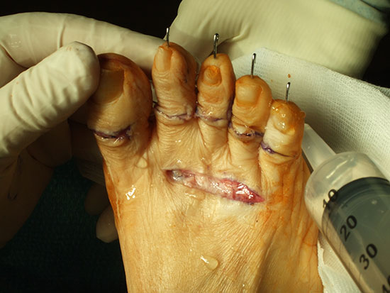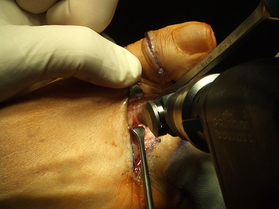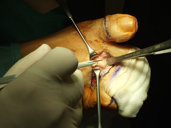 Nach der Hautinzision erfolgt die Darstellung der Strecksehnen. Die kurzen Strecksehnen werden tenotomiert. Dann wird die Gelenkkapsel des MTP-Gelenkes dorsal eröffnet und das Gelenk gründlich synovektomiert. Der kontrakte Seitenbandapparat wird scharf abgelöst. Das Metatarsaleköpfchen wird nun dargestellt und mit einer oszillierenden Säge möglichst sparsam von distal-dorsal nach proximal-plantar reseziert. Wichtig ist hierbei ein harmonisches Alignement der Metatarsalia zu erreichen. In Neutralstellung des oberen Sprunggelenkes wird nun getestet, ob sich die MTP-Gelenke neutral einstellen, sonst muss evtl. eine z-förmige Verlängerung der langen Strecksehnen angeschlossen werden, bei kontrakten PIP-Gelenken möglicherweise auch eine Arthrodese der PIP-Gelenke mit temporärer K-Drahtschienung.