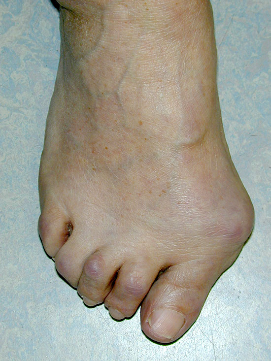 Im Krankheitsverlauf der rheumatoiden Arthritis kommt es häufig zu einem Befall der Füße mit anfangs oft unbemerkten Artikulosynovialitiden bzw. Tenosynovialitiden, die später zu typischen Gelenkdestruktionen und Fehlstellungen führen. Für die Patienten bedeutet dies meist eine erhebliche Einschränkung der Lebensqualität.
