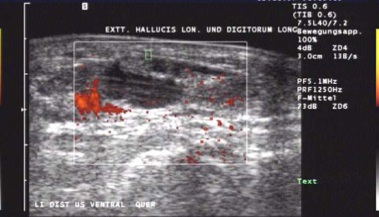 Die sonographische Untersuchung des Fußes wird in der Regel mit 7,5MHz durchgeführt. Erfasst und differenziert werden können ein Gelenkerguss bei Synovialitis, eine Bursitis bzw. eine Tenosynovialitis. Mit Hilfe des Power-Dopplers kann auch eine Aussage über die Krankheitsaktivität gemacht werden.