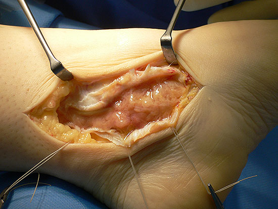 Nicht selten bestehen beim "Rheumatiker" begleitend zu einer Artikulosynovialitis oder isoliert Tenosynovialitiden. Am Fuß sind am häufigsten die Peronealsehnen, die Tibialis posterior-Sehne und die Achillessehne betroffen. Nach Versagen eines konservativen Therapieversuches einschließlich peritendinealer Cortisoninfiltration, sollten diese offen tenosynovektomiert werden, da es sonst durch Durchsetzung der Sehne mit dem entzündlichen Gewebe zu Sehnenrupturen kommen kann. Eine direkte Naht der Sehnen ist dann aufgrund des langstreckigen Befalls meist nicht mehr möglich und aufwendige Rekonstruktionen werden notwendig.