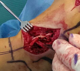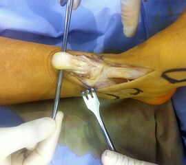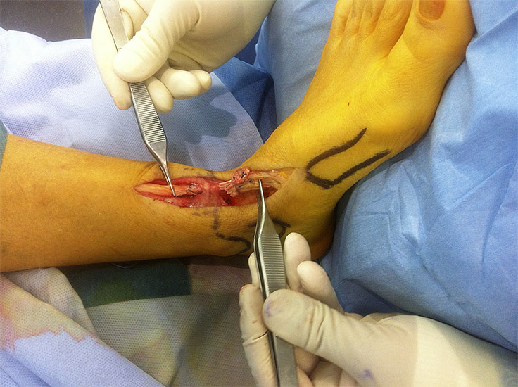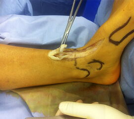- Es besteht die Möglichkeit eines freien Sehnentransplantates zur Rekonstruktion der Tibialis anterior-Sehne. Als Transplantat bietet sich die M. semitendinosis- oder M. gracilis-Sehne an.
