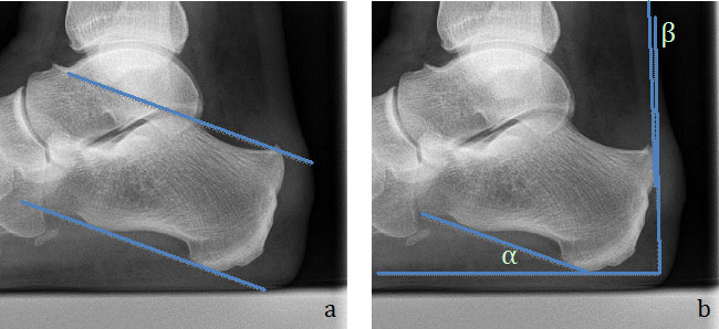 Anhand des seitlichen Fußröntgenbildes kann der Calcaneus-Boden Winkel und die Prominenz der Tuberositas des Calcaneus bestimmt werden und durch das Zusammenspiel dieser beiden Parameter die mögliche Irritation der Achillessehne durch die knöcherne Anatomie beurteilt werden. Bis heute hat sich jedoch kein Parameter etabliert, anhand dessen eine klare Abgrenzung von pathologischen Fehlstellungen möglich ist. Einzelne Arbeiten zeigen jedoch eine Korrelation der parallel „Pitch-Linien“ und des „Chaveau-Liet“ Winkels 10 zu der Erkrankung (Abb. 2).