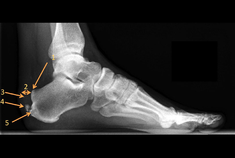 Außerdem lässt sich auf dem seitlichen Röntgenbild im Bereich der Weichteile häufig als indirektes Zeichen der retroachillären Bursitis eine Aufhellung am Achillessehnenansatz erkennen 11. Des Weiteren ist auf die Ausbildung des retrocalcanearen Recessus und die relative Dicke der Achillessehne zu achten 10. Im Bereich der Achillessehne ist auf einen Traktionsosteophyten, der aus Verknöcherungen im Bereich des Sehnenansatzes durch Mikrotraumatisierungen entsteht sowie intratendinöse Verkalkungen/-knöcherungen zu achten (Abb. 3).