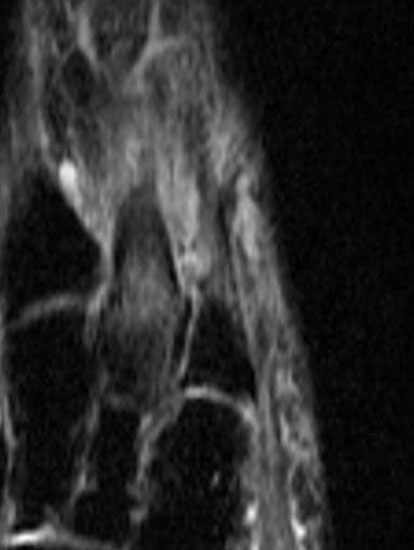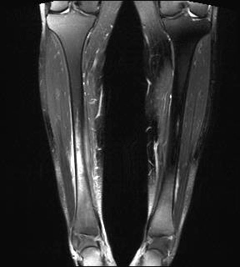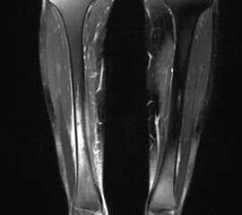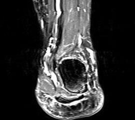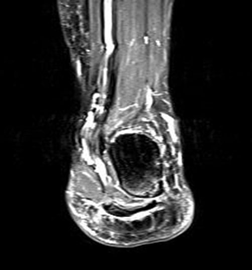 Hier befindet sich ca. 3-5 cm proximal des Tuber calcanei ein als „kritische Zone“ benannter Bezirk, der durch eine ungünstige arterielle Blutzufuhr gekennzeichnet ist (letzte Wiese). Hier finden sich häufig spindelförmige Schwellungen, die bei MRT-Diagnostik nicht selten partielle Nekrosen und Partialrupturen der Achillessehne aufweisen (Abb. 14).