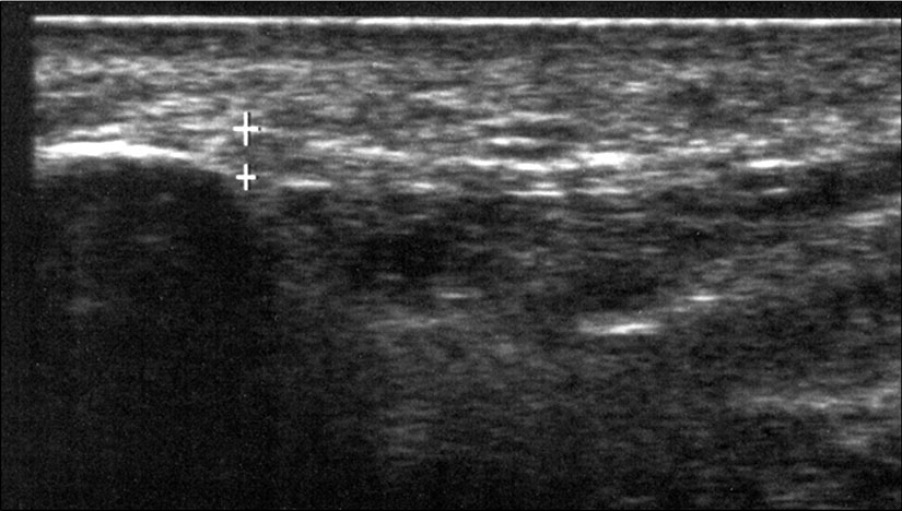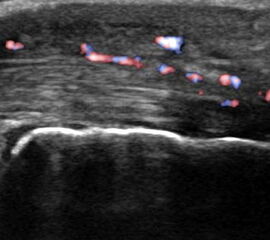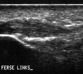 Die Sonographie zeigt im Falle einer Plantarfasziitis eine Verdickung der Plantarfaszie 24. Sie tritt etwas verzögert nach stattgehabter Überlastung und dem Schmerzbeginn auf und ist in ihrem Ausmaß ein guter Indikator für die Schwere der Erkrankung und die zu erwartende Behandlungsdauer. Die Rückbildung der Verdickung benötigt auch nach erreichter Schmerzfreiheit Wochen bis Monate.