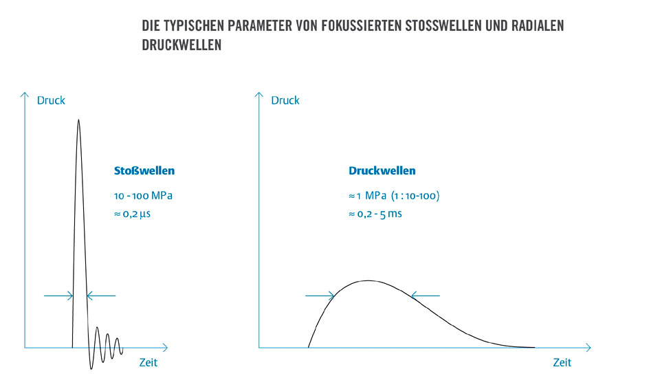 Bei dieser Form der Druckwelle ist die Pulsdauer um den Faktor 1000 länger und die Spitzendrücke um den Faktor 10-100 geringer als bei der fokussierten Stoßwelle (Wess 2006).