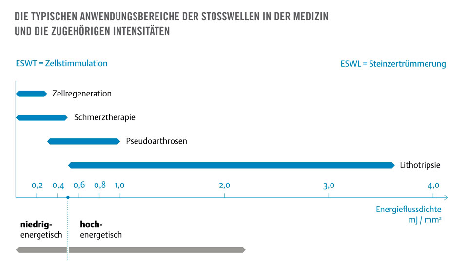 Die Energieflussdichte der fokussierten Stoßwelle wird in [mJ/mm²] angegeben. Dabei werden niedrig-, und hochenergetische Energieflussbereiche unterschieden (Novak 2010).