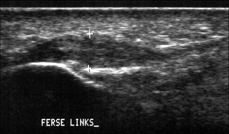 Die sonographische Diagnostik eignet sich primär zur Erkennung schmerzhafter Prozesse im Verlauf der Achillessehne und kann bei Bedarf durch Röntgen bzw. MRT ergänzt werden. Besonders bei längeren Verläufen und kräftigen spindelförmigen Schwellungen (>9mm, Normwert <5mm) im Bereich der kritischen Zone sollte ein MRT zum Ausschluss von Nekrosezonen und Partialrupturen vor Therapiebeginn veranlasst werden. Die sonographisch leicht zu erfassende Veränderung der Sehnendicke im mittleren Sehnenanteil ist ein guter Indikator für die Schwere der Erkrankung und die Beurteilung des Behandlungsverlaufes. Die sichtbaren Veränderungen am distalen knöchernen Ansatz der Sehne sind diskreter.