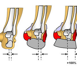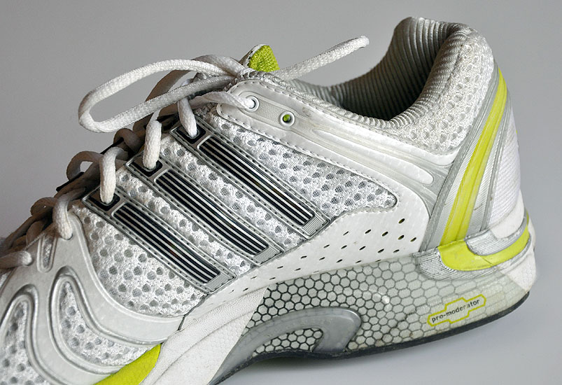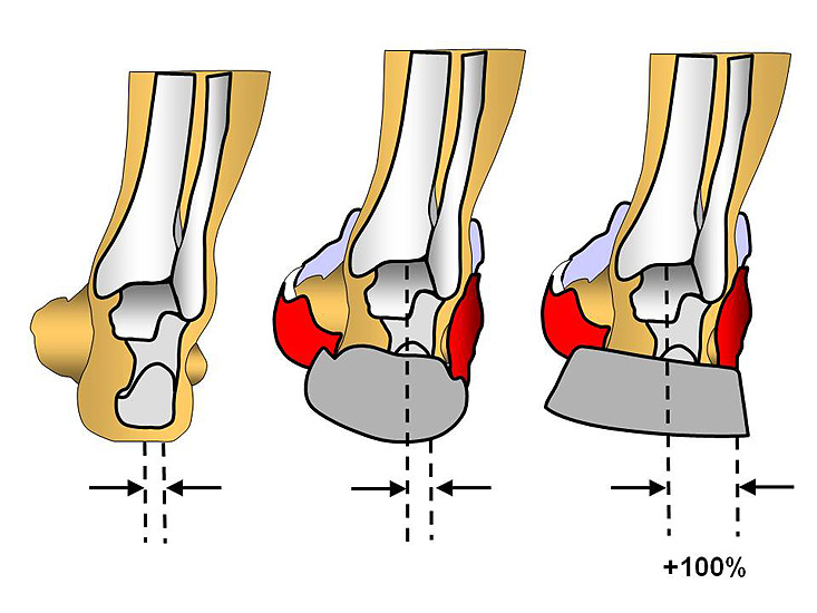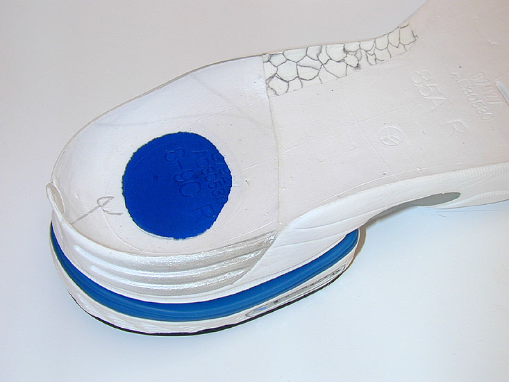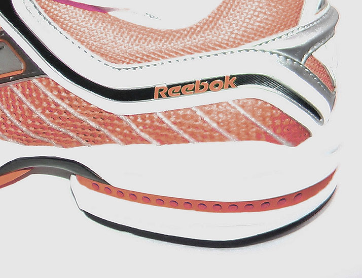 Die Reduktion von Hebelarmen im Rückfußbereich wird durch speziell abgesetzte Zonen erreicht, die sich leichter deformieren und so den Fuß beim Fersenaufsatz nicht in die Pronation drücken. Das „Crash-Pad™“ von Nike ist ein Beispiel für diese Technologie Reebok™ entkoppelt die Sohle im Fersenbereich durch multiple Materialaussparungen im Sohlenmaterial, so dass eine Bewegung von wenigen Millimetern zwischen Außensohle und dem Schuh möglich wird (Abbildung 9). Dies führt zu einer Reduktion der in Richtung Pronation wirkenden Kräfte während der ersten Millisekunden nach Bodenkontakt.
